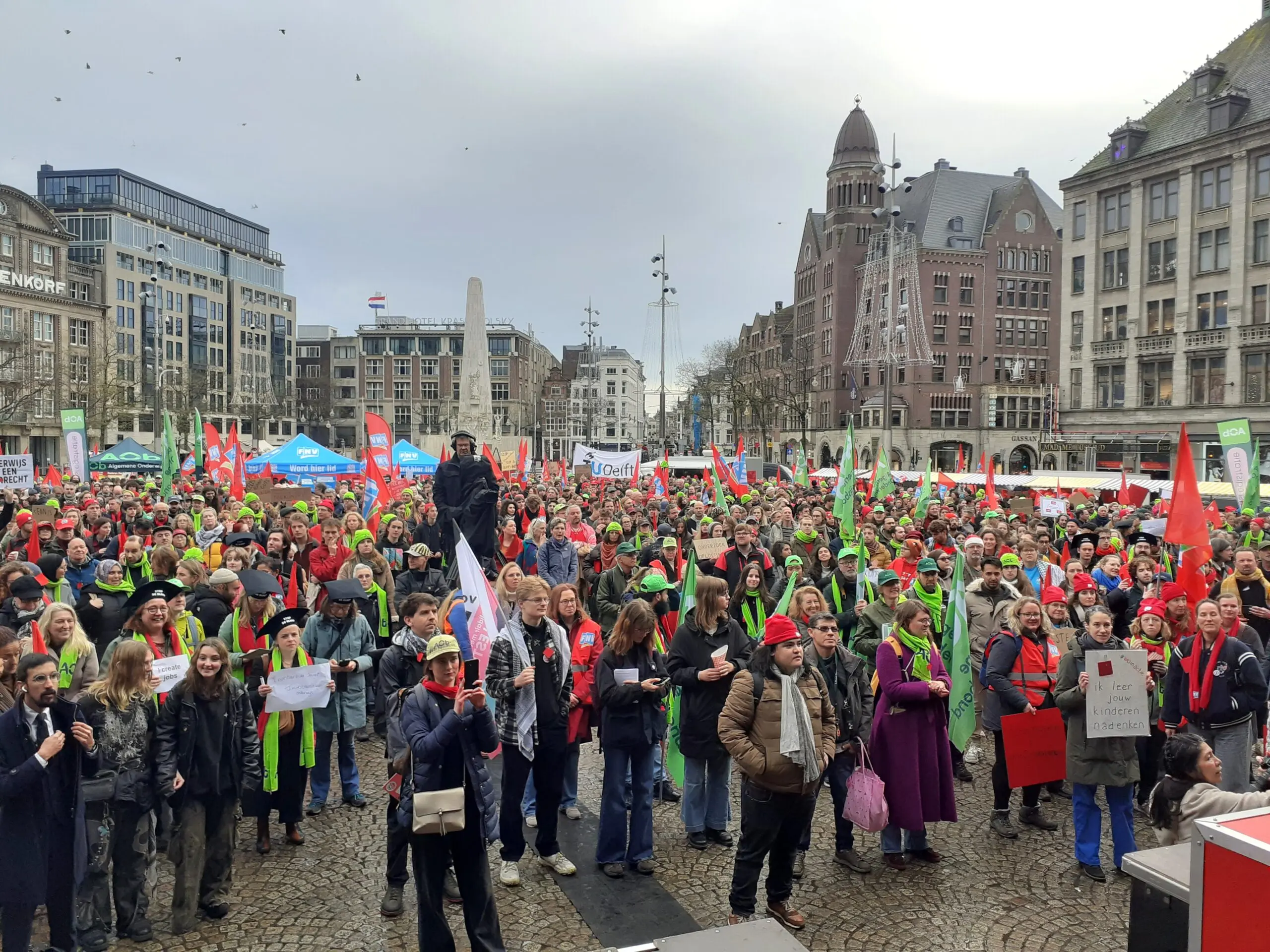 Rond twaalf uur begint de Dam in Amsterdam vol te stromen met demonstranten. Ze dragen groene petjes of rode mutsen, die de vakbonden uitdelen. Ze hebben spandoeken, vlaggen en protestborden bij zich.