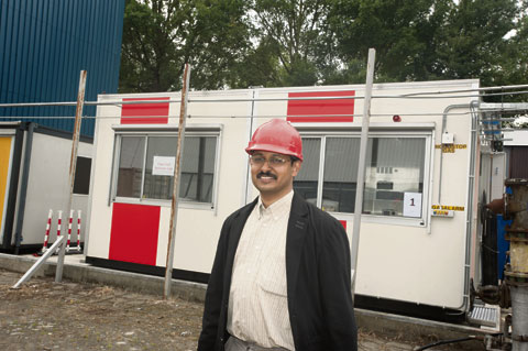 Red and blue portocabins behind the process & energy hall form the modest housing for the group’s new equipment. Assistant professor, Dr P.V. Aravind, from Mechanical, Maritime and Materials Engineering, explains the set-up. The largest installation contains a stack of fuel cells running on a mixture of gases that can be chosen from a mixing panel on the other side. A smaller set-up tests single fuel cells and in yet another assembly single anodes can be monitored while precisely analysing the electrochemical processes.