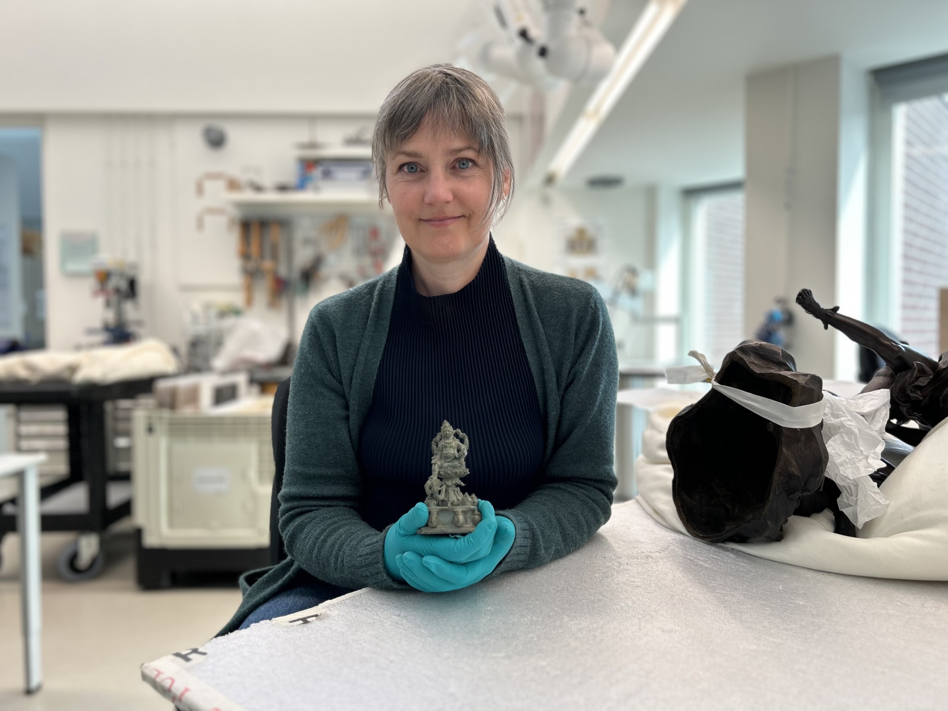 Pormovenda Yueer Li met een kopie van het beeldje dat ze met neutronen onderzocht bij het RID. (Foto: Lambert van Eijck)