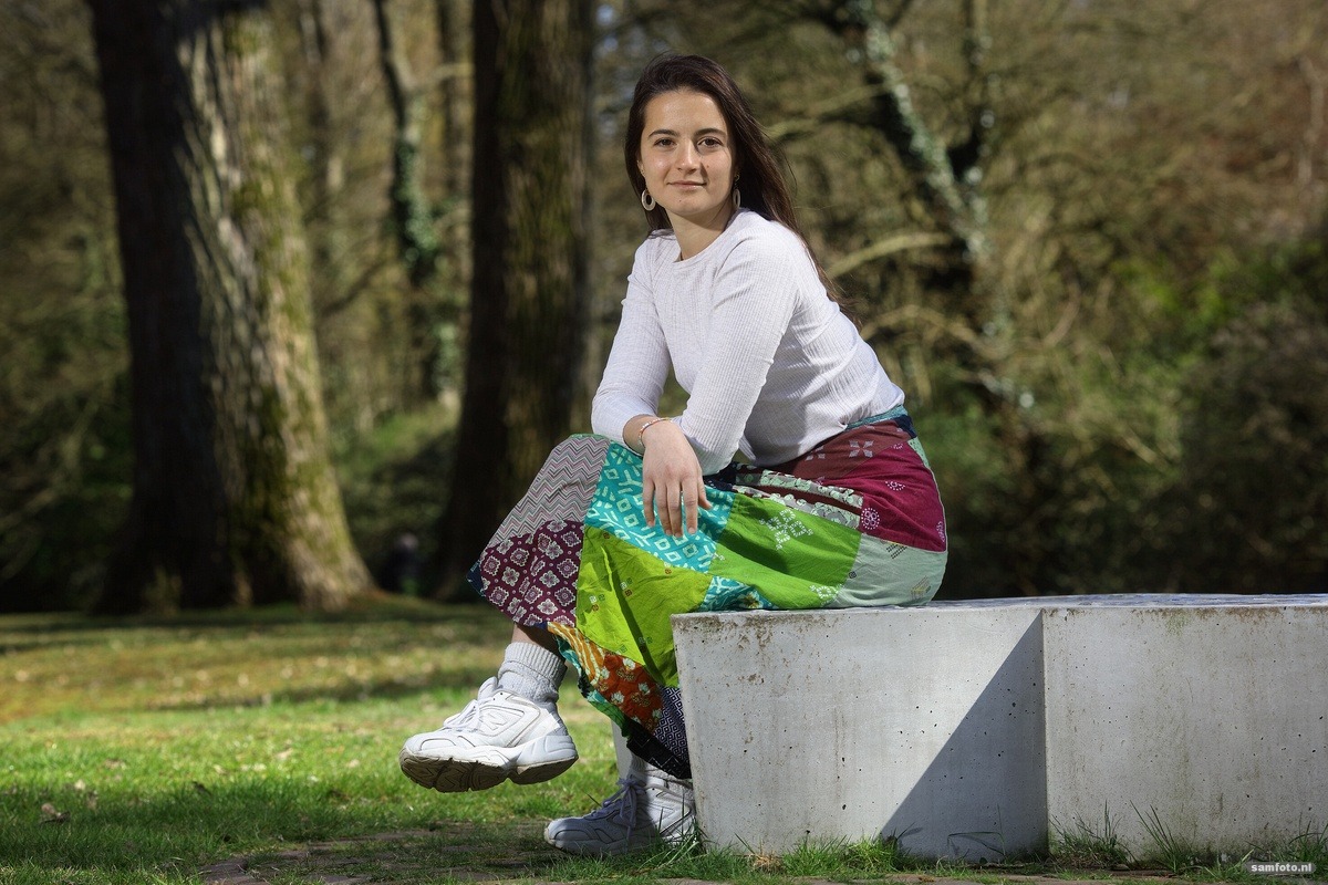Sofia Ghigliani zit op een bankje en kijkt in de camera