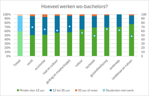 Van de wo-bachelorstudenten heeft 62 procent een bijbaan (zie de stipjes in de grafiek), dus dat is vergelijkbaar met het hbo. Ook hier zijn weer flinke verschillen. In de sector gedrag & maatschappij heeft 71 procent een bijbaan; dat aandeel is nog geen 50 procent bij techniek en bij landbouw & natuurlijke omgeving.