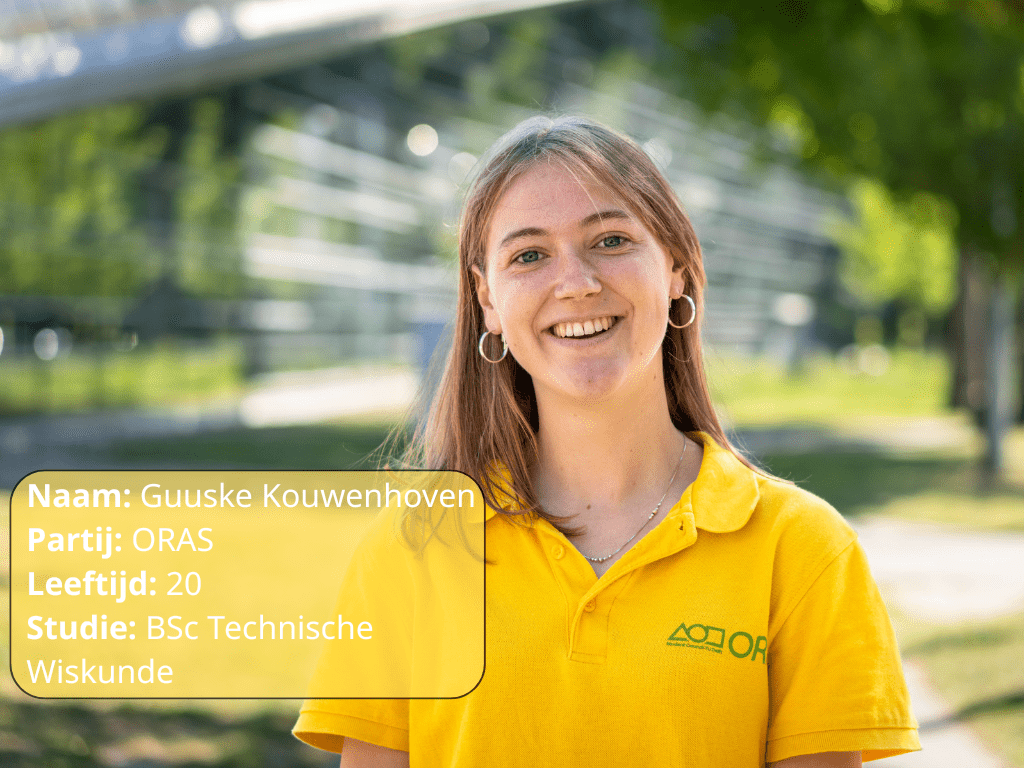 Guuske Kouwenhoven, Oras: “De bezuinigingen mogen niet ten koste gaan van onderwijskwaliteit en duurzaamheidsinitiatieven. Het moet voor elke student mogelijk zijn om een commissie, bestuur, dreamteam of stage te doen. Als er bezuinigd moet worden, dan liever op meubilair, catering en elektriciteitskosten.”