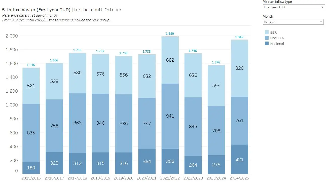 Gekeken naar de studenten die zich van buiten de TU meldden voor een masteropleiding (hier zijn de doorstromers vanuit de TU-bacheloropleidingen dus buiten beschouwing gelaten) stijgt het aantal internationals én het aantal Nederlandse studenten.
