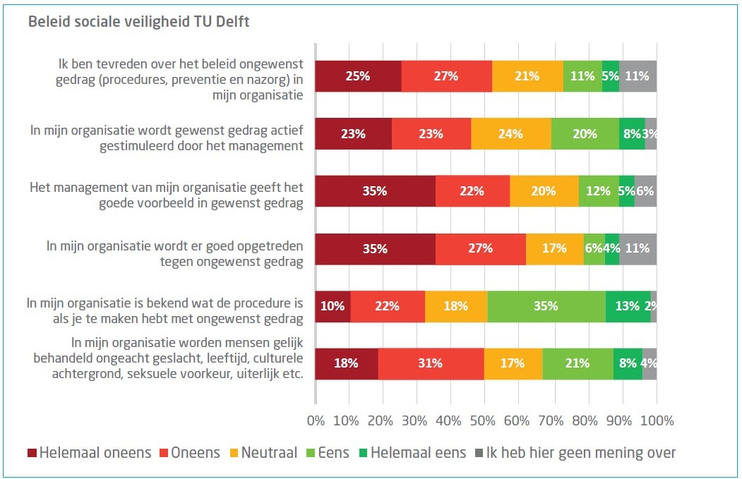 Daarnaast blijkt het vertrouwen in het management laag. 55 procent heeft vertrouwen in het leiderschap van de eigen leidinggevende, 33 procent in dat van het bestuur van de eigen faculteit of dienst en 9 procent in dat van het college van bestuur. De respondenten zijn dan ook kritisch op het sociale veiligheidsbeleid: