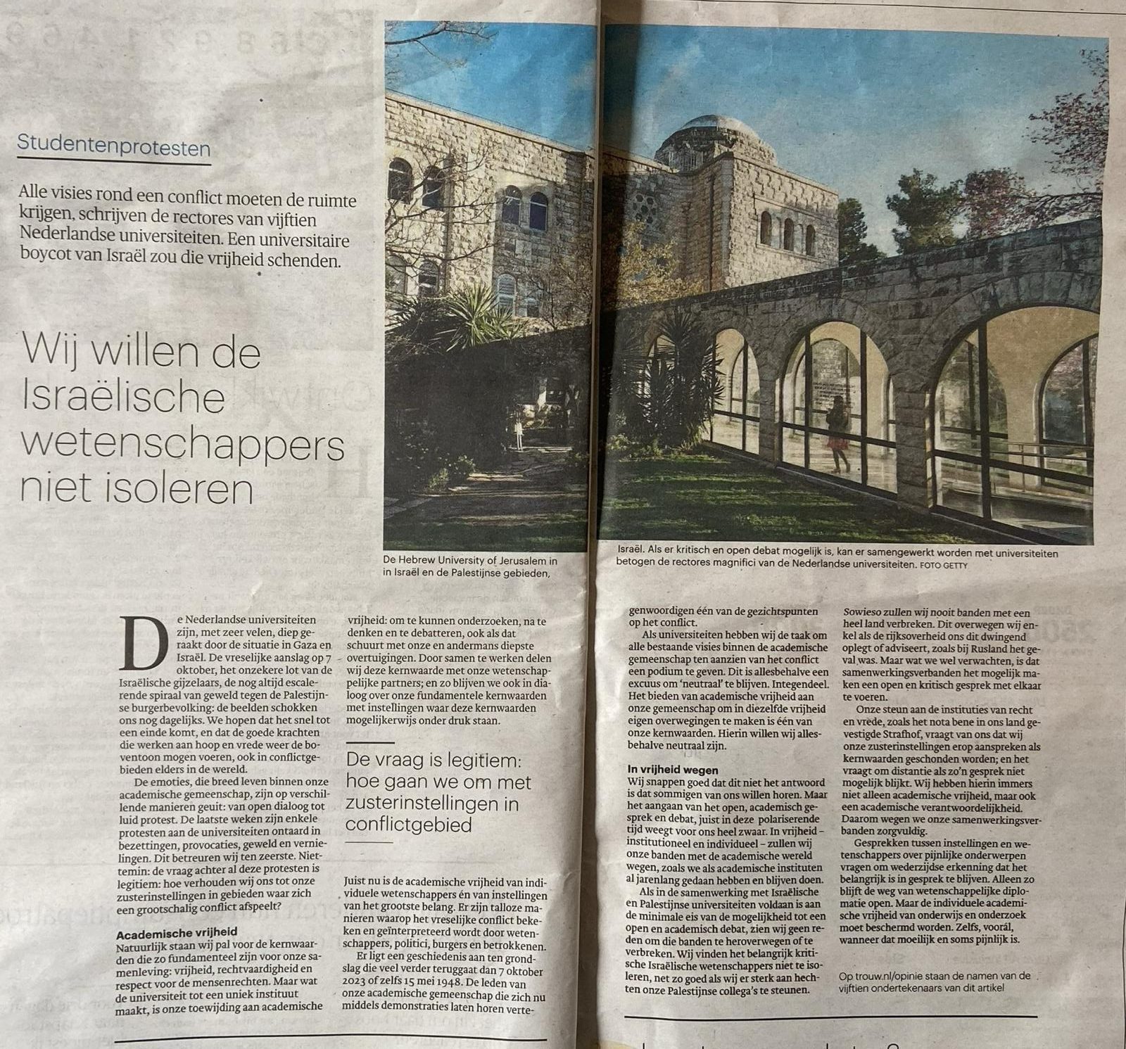 This was written by fifteen rectors of Dutch universities on June 8, 2024, in a joint op-ed in the Dutch newspaper Trouw. They cite academic freedom and the opportunity for academic debate as their main reasons.