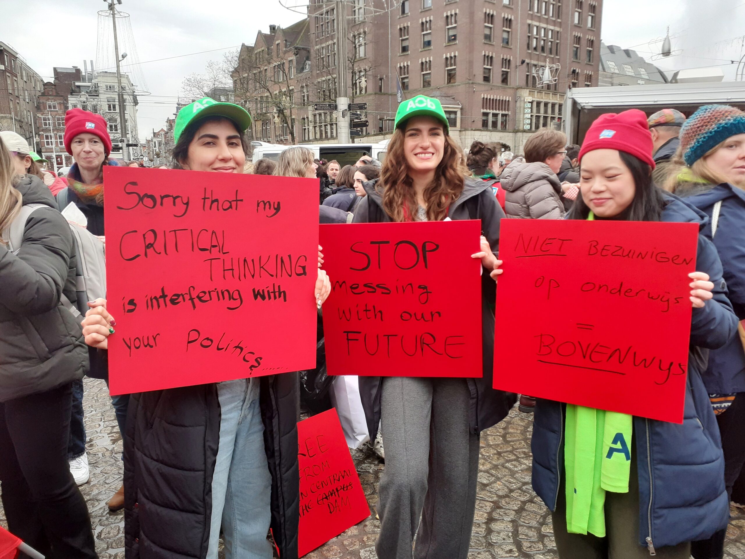 Among the protesters (but not on stage) is Maaike Krom, chair of the National Student Union. She is ‘delighted’ with the turnout. She believes there could have been even more people if everyone had been given time off. “Some students were simply not allowed to be absent from their classes!”