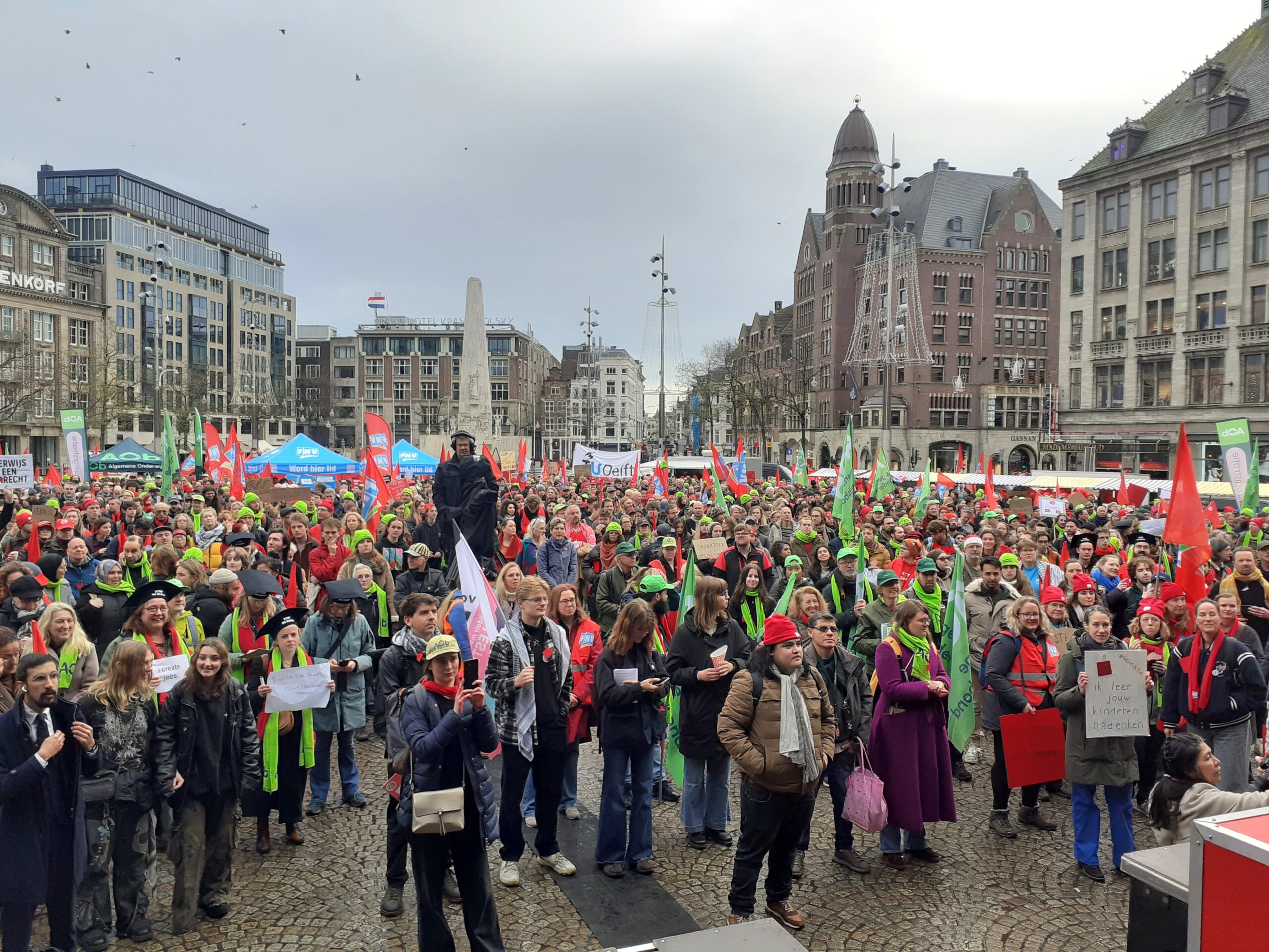 Around noon, Dam Square in Amsterdam begins to fill with demonstrators. They wear green caps or red hats, which are handed out by the trade unions. They carry banners, flags and protest signs.